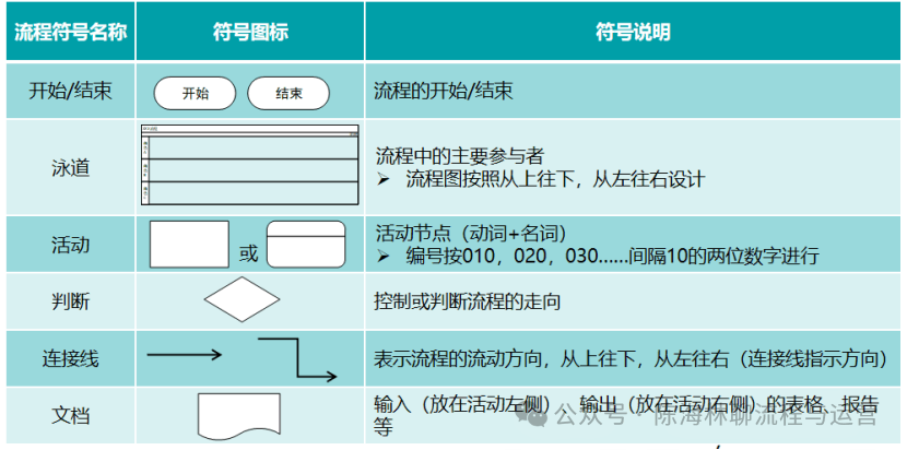 遵循标准的流程建模有三大价值 1.有利于交流 业务人员、业务流程专家和IT 人员通过一套共同的符号集、语言和技术进行交流。 2.简化设计、分析和评估 流程模型在形式和方法上保持一致,简化了设计、分析和评估。 3.有利于复用 成员可以在不同文档/工具中复用,提升业务管理的效率。 二、基础:掌握流程图的“核心语法” 流程图是一门语言。想说得清楚,先学字词与语法。 流程图六大核心符号与使用规范: