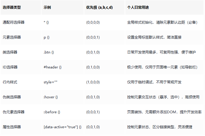 特殊情况:!important(急救工具,谨慎使用)在样式属性后添加 !important 个人常用场景:结合日常开发经验,我仅在两种场景下使用!important:1. 覆盖第三方组件的行内样式(无法修改组件源码时,临时急救);2. 全局紧急样式(如网站维护提示、错误弹窗等,需强制显示);常规业务样式坚决不使用,避免埋下维护隐患。 同优先级规则:个人总结“后发制人”若两个选择器的 (a,b,c,d) 数值完全一致,遵循“后发制人”原则——后编写的样式会覆盖先编写的样式;若引入多个CSS文件,后引入文件中同优先级的样式,会覆盖先引入文件中的样式。我曾因忽略编写顺序,修改许久样式仍不生效,这个坑大家一定要记牢。 优先级可视化示例:个人排查问题的参考给大家分享一个可视化示例,同一个p标签被多个选择器命中,可直观看到最终生效的样式,我平时排查优先级问题时,经常用这种思路,新手可直接参考: 优先级记忆口诀:个人整理,简单好记分享一个我自己整理的记忆口诀,避免记混:行内第一,ID第二,类第三,元素第四;逐位比较,高位优先;同优先级,后写生效;!important 破一切,慎用为上!多念几遍就能记住,我现在日常开发仍会用到。 六、选择器最佳实践:避坑+高效(个人日常开发习惯)代码高亮:
