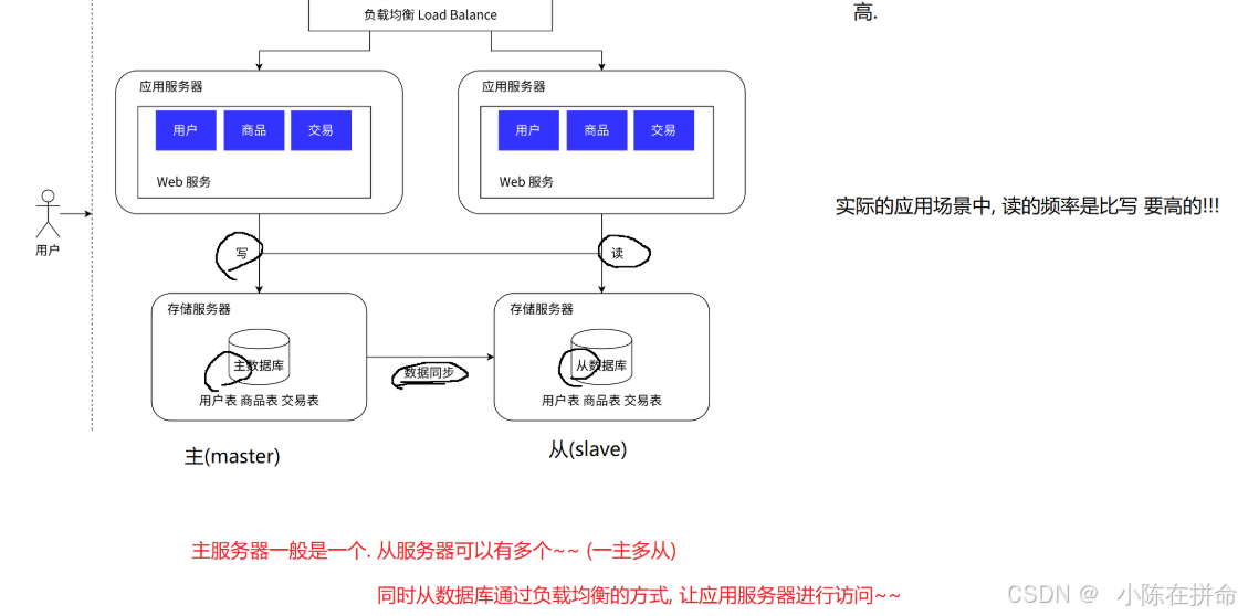 我们把用户的请求通过负载均衡分发到不同的应⽤服务器之后,可以并⾏处理了, 并且可以随着业务的增⻓,可以动态扩张服务器的数量来缓解压⼒。但是现在的架构⾥,无论扩展多少台服务器,这些请求最终都会从数据库读写数据,到⼀定程度之后,数据的压⼒成为系统承载能⼒的瓶颈点。我们可以像扩展应⽤服务器⼀样扩展数据库服务器么?