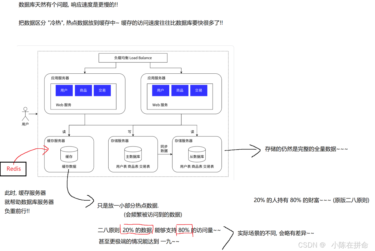 5、引入缓存,冷热数据分离:(根据二八原则)进一步提高服务器针对请求的处理能力,redis在分布式系统中,通常扮演着缓存这样的角色 ,用来存储热点数据。