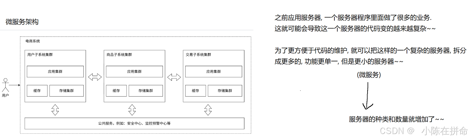 负载均衡是为了解决请求增多的问题,分库分表是为了解决存储空间不足的问题。而微服务本质上是为了解决人员组织结构的分配问题(一般是大厂,如果是小公司没几个人搞微服务就没啥必要)----->当应用服务器复杂了,势必就需要更多的人来维护,而人多了就需要配套的管理来把这些人组织好,通过划分组织结构分成多个组(分工,也是更好划分责任),每个组分配领导进行管理