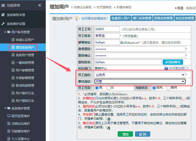 所以一般情况下,兼任岗位只可用于单位内部的OA系统主管兼任网管,以方便日常OA系统维护: