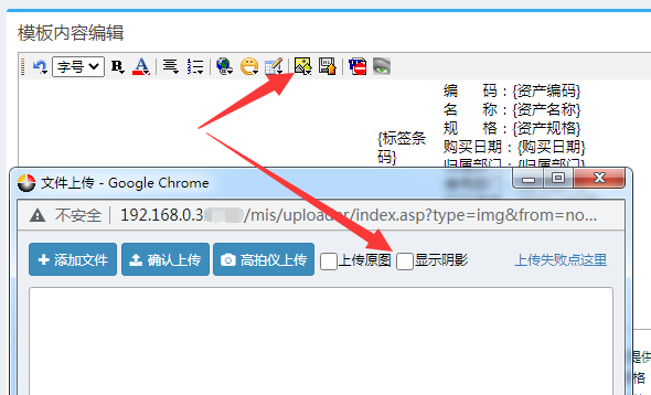 在标签模板设计页面中,可以插入LOGO图片,插入图片时,需要取消“显示阴影”,否则会导致LOGO图片带上阴影。保存后,标签上就会看到单位LOGO图片了。