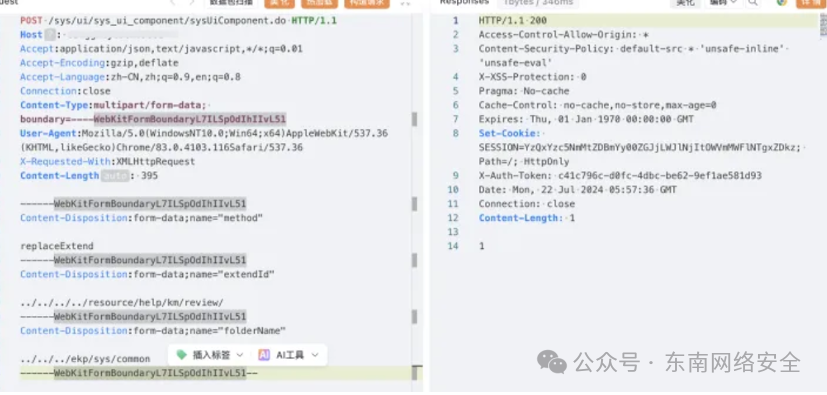 ​POST /sys/ui/sys_ui_component/sysUiComponent.do HTTP/1.1 Host:  Accept:application/json,text/javascript,*/*;q=0.01 Accept-Encoding:gzip,deflate Accept-Language:zh-CN,zh;q=0.9,en;q=0.8 Connection:close Content-Type:multipart/form-data; boundary=----WebKitFormBoundaryL7ILSpOdIhIIvL51 UserAgent:Mozilla/5.0(WindowsNT10.0;Win64;x64)AppleWebKit/537.36(KHTML,likeGecko)Chrome/83. 0.4103.116Safari/537.36 X-Requested-With:XMLHttpRequest Content-Length: 395 ------WebKitFormBoundaryL7ILSpOdIhIIvL51 Content-Disposition:form-data;name="method" replaceExtend ------WebKitFormBoundaryL7ILSpOdIhIIvL51 Content-Disposition:form-data;name="extendId" ../../../../resource/help/km/review/------WebKitFormBoundaryL7ILSpOdIhIIvL51 Content-Disposition:form-data;name="folderName" ../../../ekp/sys/common------WebKitFormBoundaryL7ILSpOdIhIIvL51-