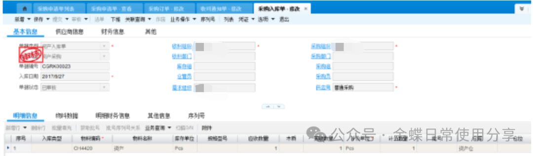 【操作说明】:采购订单下推收料通知单,若实际业务需要入库且该资产物料设置了允许库存,则填写仓库,否则直接提交审核,没有入库动作的直接看2.8。