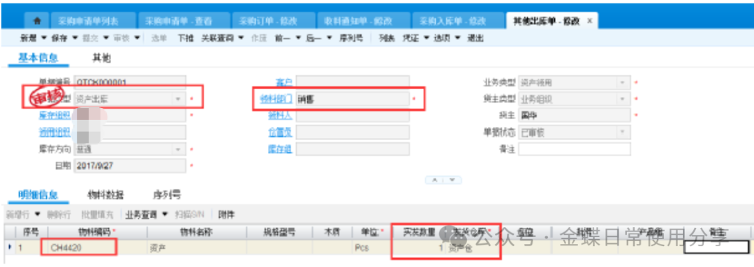 【操作说明】:已入库的资产在领用时需要进行出库处理,新增其他出库单,更改单据类型为资产出库,填写领用部门、物料编码、实发数量、发出仓库等信息并提交审核。