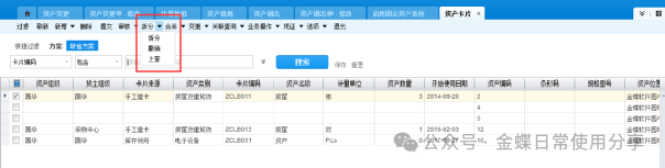 注意:当一张卡片一卡多物的时候,在进行调入等日常管理时,该卡片上的所有东西都要进行该操作,变更频繁的固定资产,不宜一卡多物。