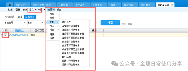 选中需要盘点的盘点表,在选项中,点击套打,选中连续套打所选单据进行套打