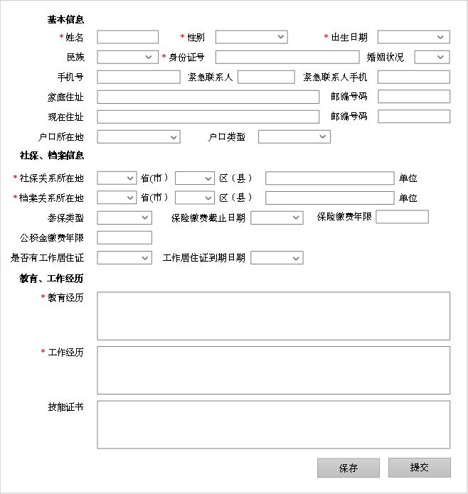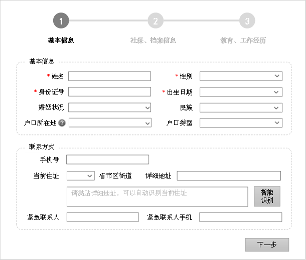 图7 x 拆分后的页面2:社保档案信息录入 最后来到了步骤三,如图7-x。 在教育经历、工作经历的文本框中,用淡灰色文字做了格式要求的示意,这并非强制要求,但通过提示,希望用户尽量能按照清晰地逻辑结构描述相关信息,否则用户填写的方式,绝对五花八门。