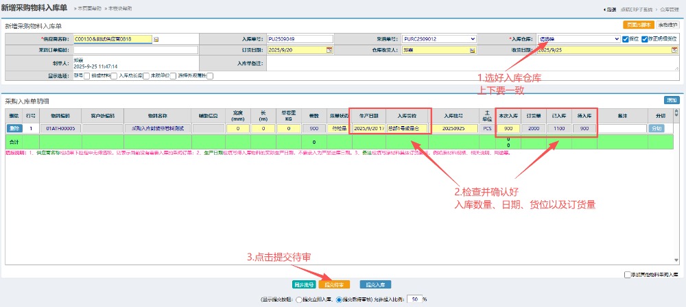 进入入库界面,先选择好入库仓库,然后确认好物料的入库数量、订货量和日期,点击提交待审