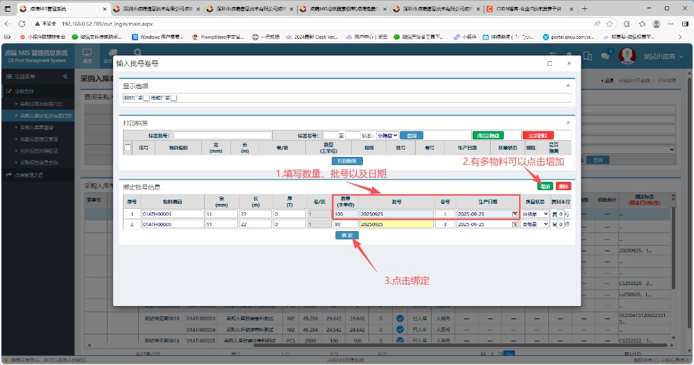 在弹出的信息窗口内,填写数量和日期。如果有多物料的话可以在右边点击增加,然后点击绑定
