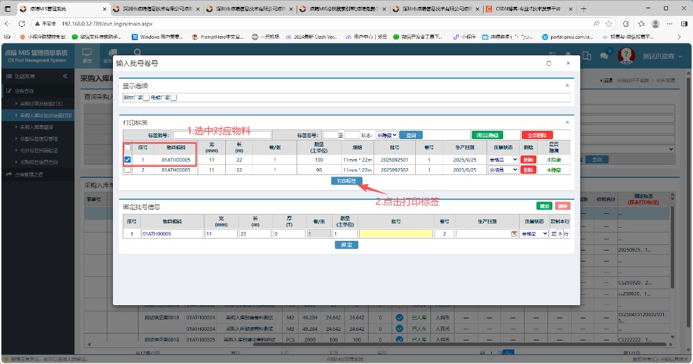 绑定之后,在页面内左手边选好对应物料进行勾上,点击打印标签