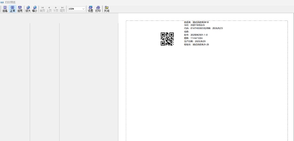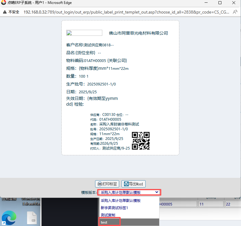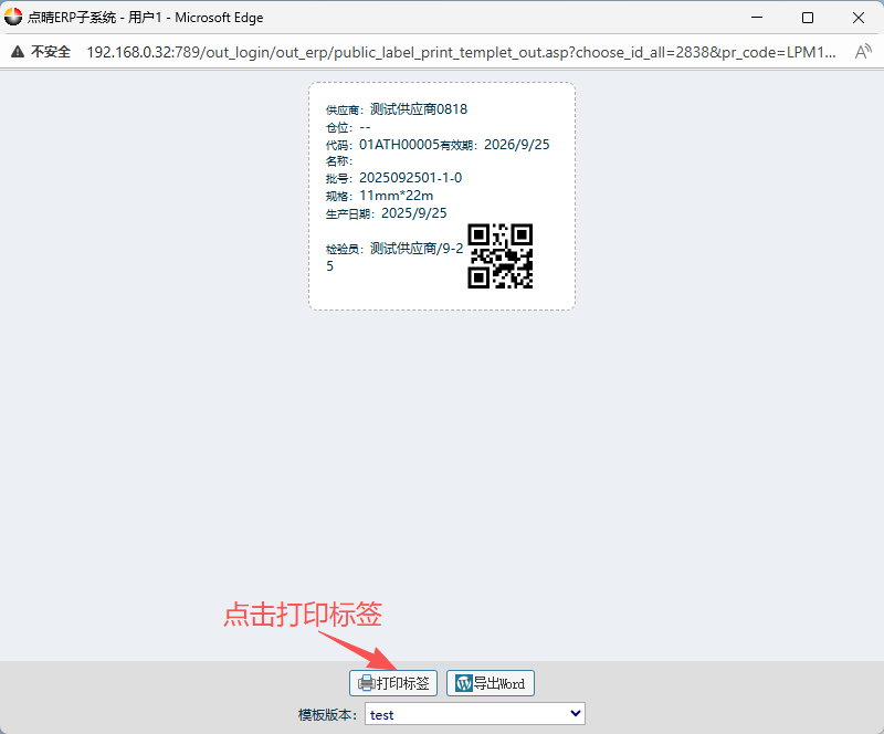 7.在二维码标签界面内,模板选择“test”,点击打印标签。然后就会弹出打印预览界面