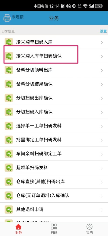 8.进入到打印预览页面后,在手机打开“点晴业务通app”,点击“按采购入库单扫码确认