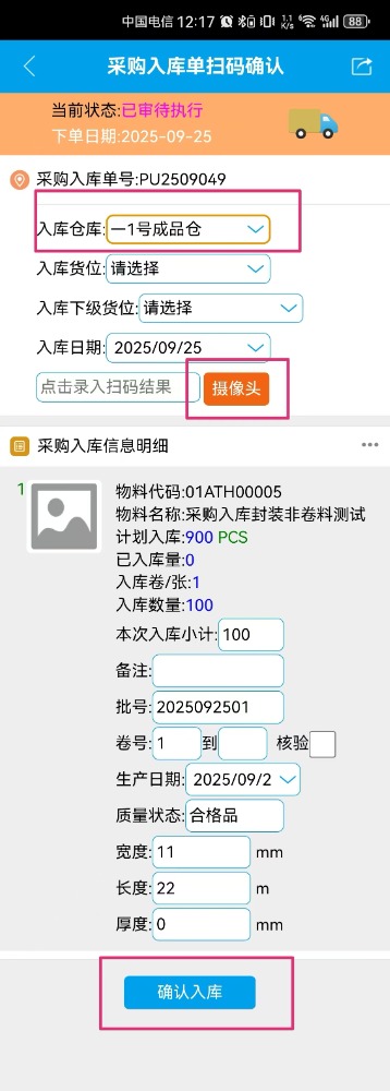 9.手机点击按采购入库单扫码确认进去后,点击“摄像头”,对刚才的打印预览界面内的二维码进行扫码操作。