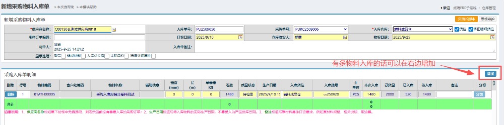 多物料入库的话可以在右边点击增加。