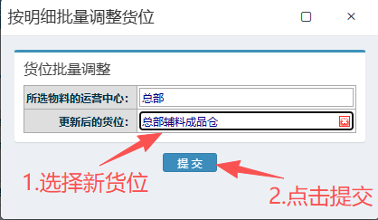 在弹出的调整货位窗口内,选择新货位,然后点击提交