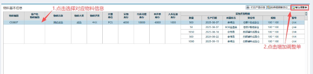 3.回到刚才的页面,新增调整单操作:点击对应物料信息,然后点击“增加调整单