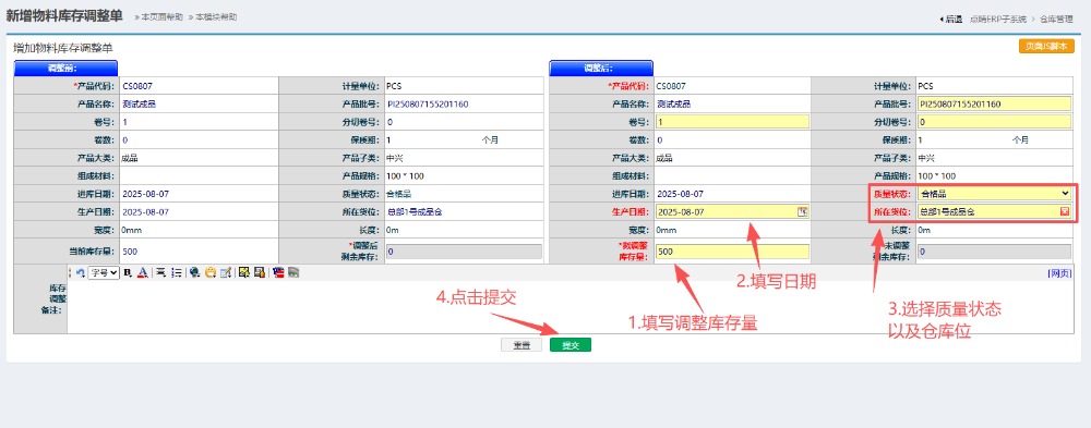 接着会跳转到新页面,按图操作:填写调整库存量以及日期,选择质量状态以及仓库位。最后点击提交