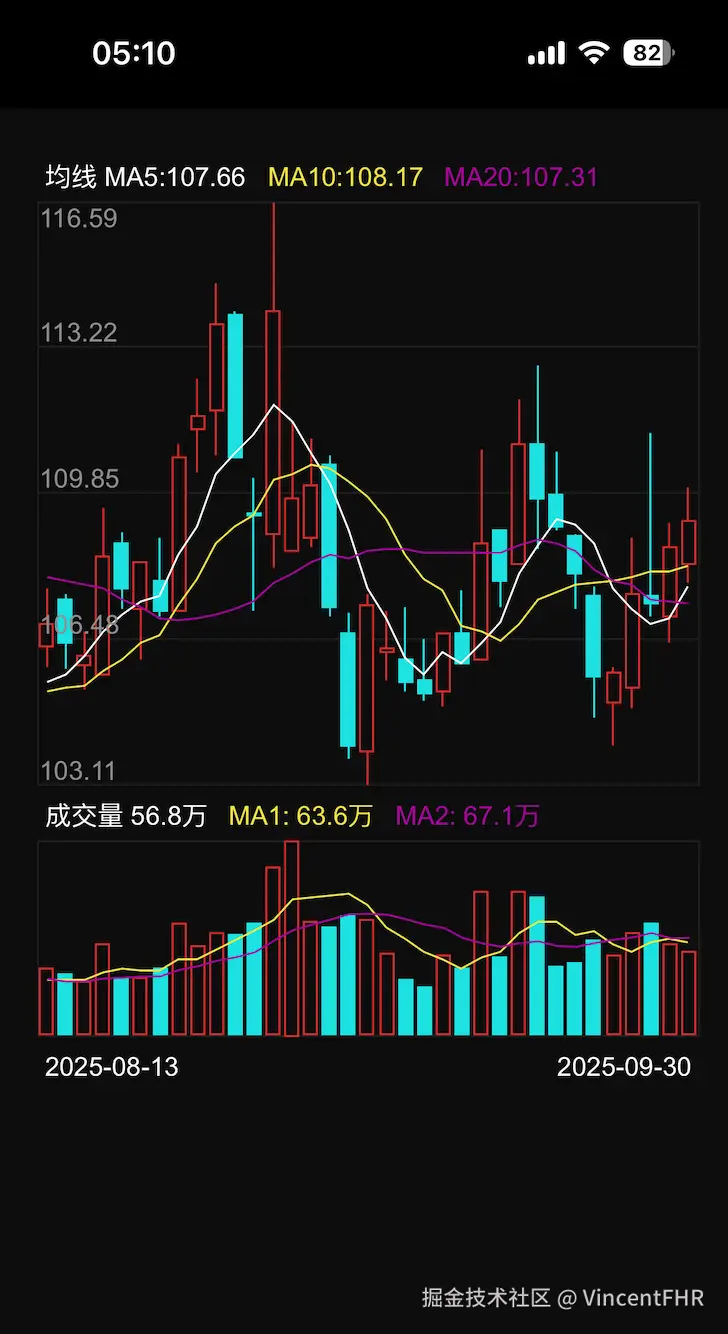 从上面的图可以看出, 需要画 5日均线、10日均线、20日均线, 成交量快线(10日)、成交量慢线(20日) 但是, 接口没有给出当日的均线值, 需要自己计算。