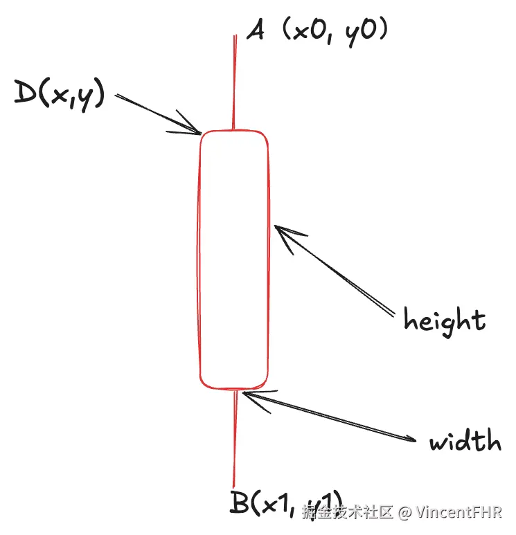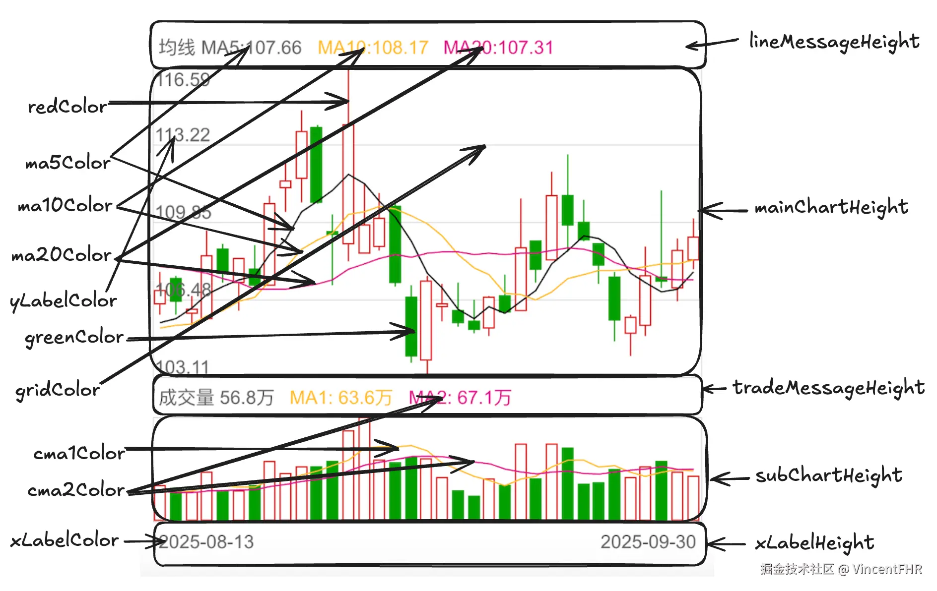 为了方便样式自定义, 我独立出一个默认的配置对象 defaultKlineConfig, 参数的含义如下图所示,其实下图这个风格的标注, 是通过 excalidraw 这个软件画的, 也是 canvas 做的开源软件, 可见 canvas 在前端可视化领域的重要性, 这个扯远了,打住。