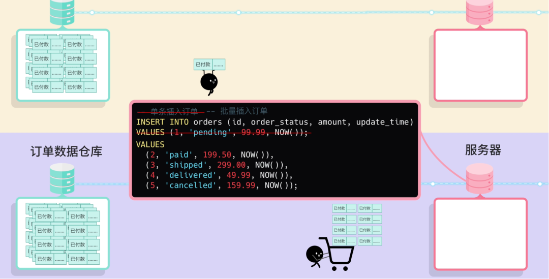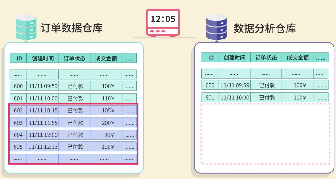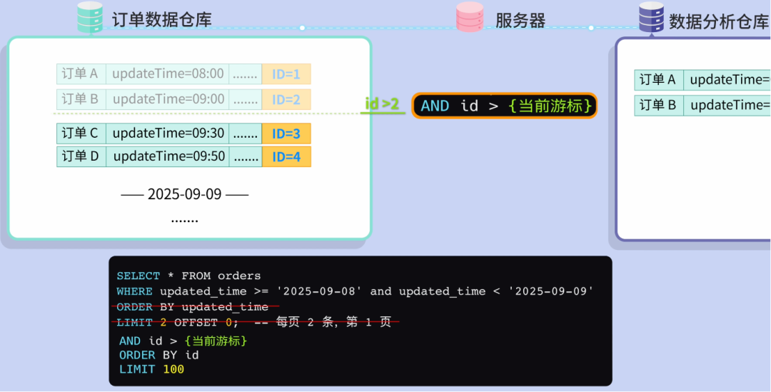 查询结果返回订单 A(08:00)和订单 B(09:00),同步完成后将偏移量调整为下一页 可就在查询下一页前,订单 B 因为 “修改订单状态” 被更新,这时订单 B 的更新时间就不在查询范围内了。 这就导致查询下一页 ![]() 怎么解决这个问题呢? 这可难不倒你小阿巴,既然 动态数据集 中使用 SQL 自带的 OFFSET 偏移作为分页起点会出问题,那不妨 自定义一个标志来记录下一批要同步的起点。 这就是游标机制。 比如我约定自增的主键 id 作为游标,每查询一批数据之后,把这批数据的最后一条记录作为新的游标值;查询下一批数据时,只查询 id > 游标的数据。 ![]() 这样不仅防止数据丢失,还避免了 OFFSET 深度分页带来的性能问题。 此外,如果把游标想象成进度条的断点,可以更清晰地记录同步进度,失败后可以从断点继续。 做完这一通优化后,你长吁了一口气,工作看来是保住了。 ![]() 性能优化你以为终于可以安稳一段时间了。但没想到,公司的好日子才刚刚开始。 随着老板大力扩张业务,公司每天的订单量可以达到百万条,你的同步任务每次要跑几个小时才能完成。 更要命的是,老板现在对数据的依赖越来越强,要求每隔 2 个小时就要同步一次数据! 怎么能够让任务执行更快呢? 这时,你想起了曾经在 程序员面试神器 - 面试鸭 上背过的各种性能优化八股文。好家伙,终于能派上用场了! ![]() 首先,修改插入数据库的操作方式。之前是一条一条地插入订单数据,改为执行一条批处理语句来同时插入同一批内多个订单数据,减少了跟数据库通信的次数,性能大幅提升。 ![]() 但是你觉得还不够快,于是优化了批处理的流程。之前是等一批同步完再同步下一批,串行执行;现在你启动了多个线程,每个线程负责处理一批订单的同步,多个线程可以同时搬砖干活,效率大幅提高。 ![]() 这一通操作下来,老板都激动了:“小阿巴,你这技术可以啊!好好干,我给你升职加薪!” 你笑了,有了老板这句话,你想继续努力给公司卖命了。 ![]() 实时同步两年后,随着你头发的消逝,公司总部决定要上市了! ![]() 老板找到了你:“阿巴阿巴,咱们的数据同步能不能做到实时?我想给投资人展示实时的业务监控。最好是用户刚下单,投资人立刻就能在大屏幕上看到!" ![]() 你早料到会有这个需求,帅气地甩出一句话:“交给我吧,我让你见识一下企业级方案!” ![]() 这两年你也没闲着,像实时数据分析这种典型需求的实现方案,你早已烂熟于心。 普通的定时任务已经无法满足实时性的要求,只能搬出 CDC + 消息队列 这两大杀器了。 CDC(Change Data Capture)就像给数据库安装了一个 24 小时实时监控的摄像头,数据有任何变化,摄像头都能立刻发现。 消息队列就像一个快递中转站。数据库变化的消息先发送到这个中转站,然后同步数据的程序从中转站取出数据并写入到数据分析仓库中。 ![]() 有了中转站后,如果消息特别多,程序来不及处理,也不会丢失数据。 实现了这套方案之后,用户只要一下单,100 毫秒内老板就能在仪表盘上看到。而且保险起见,你还给消息队列加了个监控,如果消息堆积太多,就会自动告警。 他开心得像个孩子:“小阿巴,我给你升职加薪,还给你带新人!” 你又笑了,开始幻想着你和新人坐在高高的办公桌上,你给他讲述自己光辉事迹,他向你投来羡慕的目光。 ![]() 方案完善半个月后,公司迎来了双十一大促活动。 你正在和新来的实习生阿坤吹牛皮,没想到瞬间产生了大量订单,像洪水一般,让你的实时同步系统出现了各种异常: