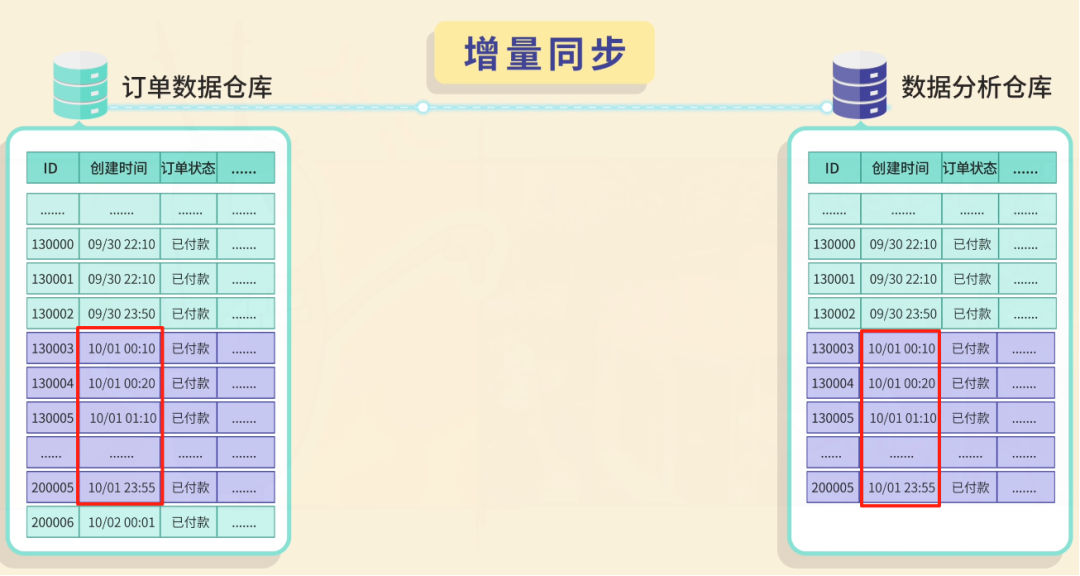 全量同步什么是数据同步呢?就像你有两个手机,要把其中一个手机的照片复制到另一个手机里。数据同步就是把一个数据库的数据,定期复制到另一个数据库里。 你心想:这还不简单吗?我写个定时任务,每天 把整个订单表的数据 全部查出来,然后 一股脑插入 到数据仓库! ![]() 这种方法叫 全量同步,不管数据有没有变化,每次都把所有数据重新复制一遍,简单粗暴。