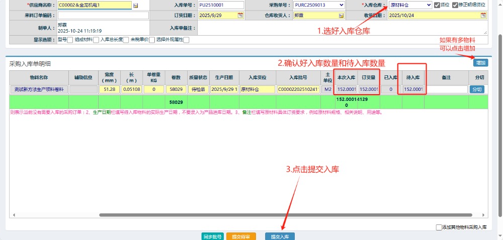 3.点击入库后跳转到”新增采购入库单“页面,按图操作:选好入库仓库,确认好入库数量待入库数量,最后点击提交。