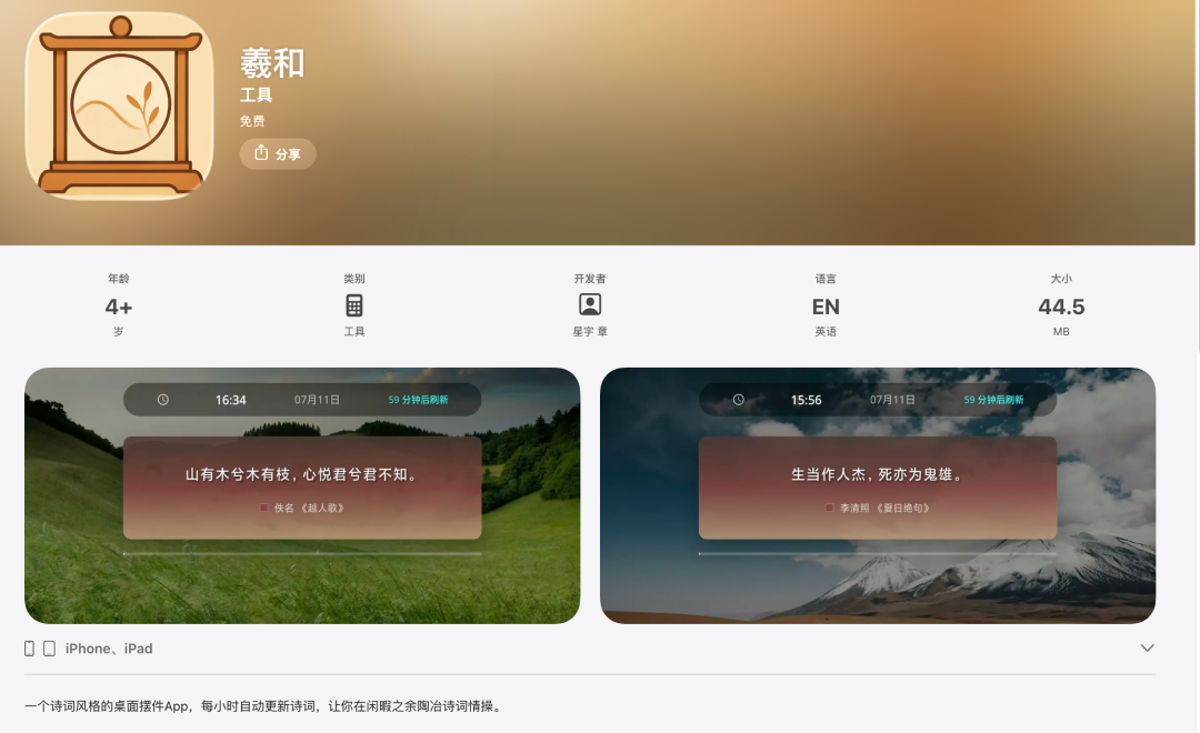 它能够显示时间和一句随机诗词,点击屏幕或者等待一小时,诗词内容会自动刷新,让你的手机变成一个优雅的桌面摆件。