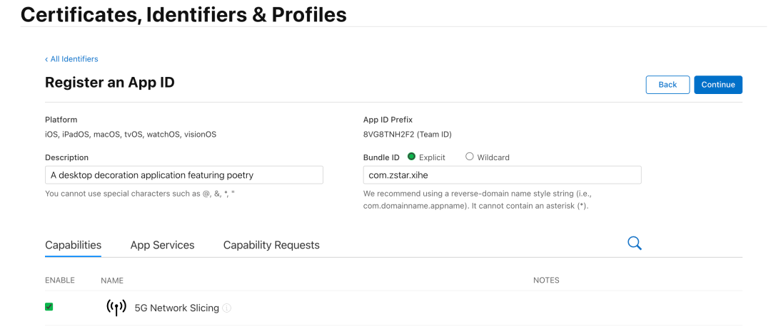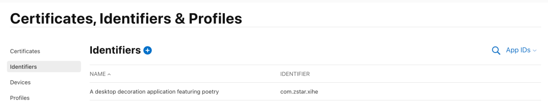 下面先在Identifiers里面注册一个应用,填写基本介绍和标识符,这个标识符类似于Android里面的包名,用来在系统中区分不同的App。