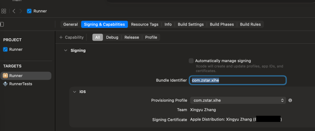 在 Targets->Signing 中,取消勾选自动管理签名,将上一步得到的.mobileprovision文件手动进行导入。