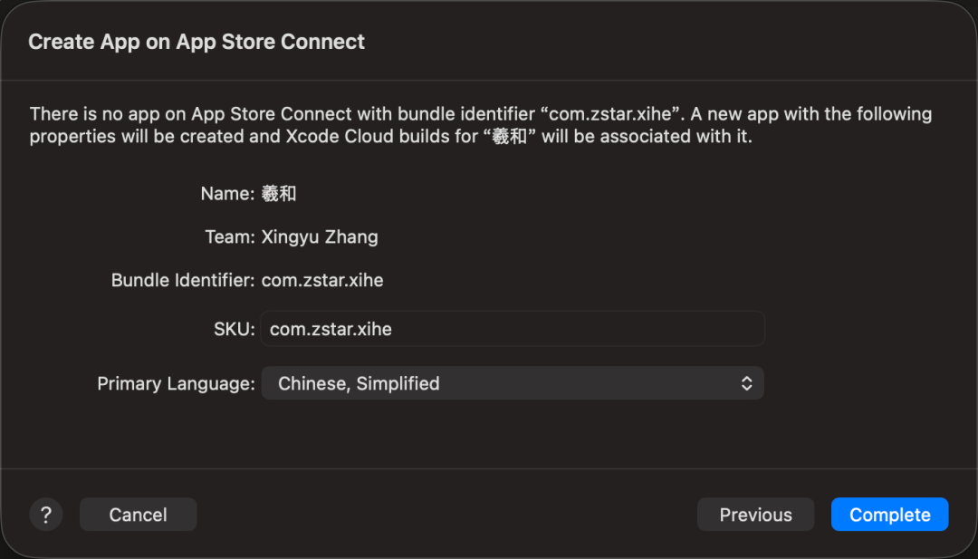 上传前,需要核对网页中设置的Bundle Identifier 和本应用的 SKU (唯一识别码),完全匹配才能继续上传。