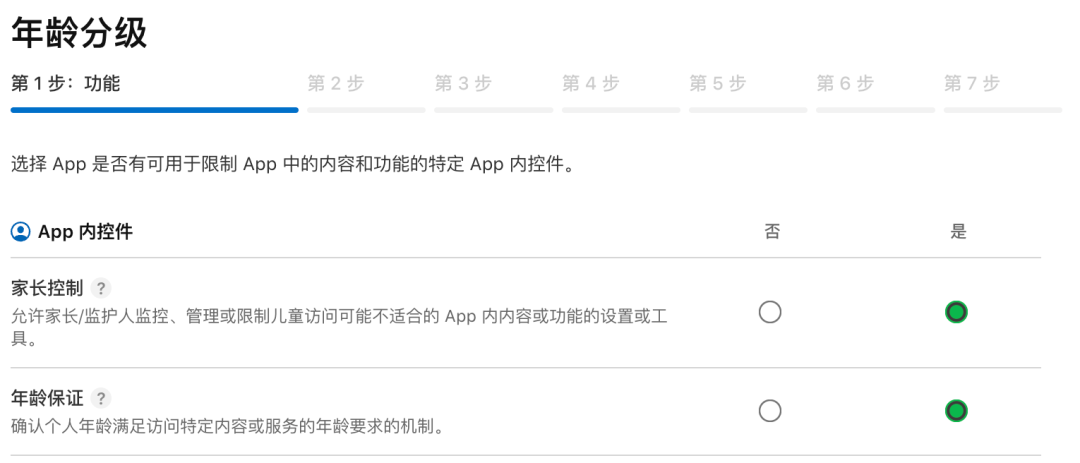 • 问题一:在年龄分级那里,勾选了:家长控制年龄验证,但实际的 App 时,没有发现这些功能。