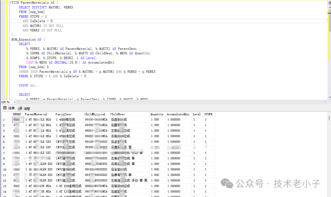 在企业级数据处理中,BOM(物料清单)数据的处理一直是让开发者头疼的问题。特别是当客户要求将复杂的多层嵌套BOM结构展开成一层结构时,如何保证数据准确性、性能优化和业务逻辑的正确实现?今天就来分享一个真实项目中的SQLServerBOM数据展开解决方案,这个主要是有同事需要用BOM做回冲,说是要某些叶子级物料,用CTE...